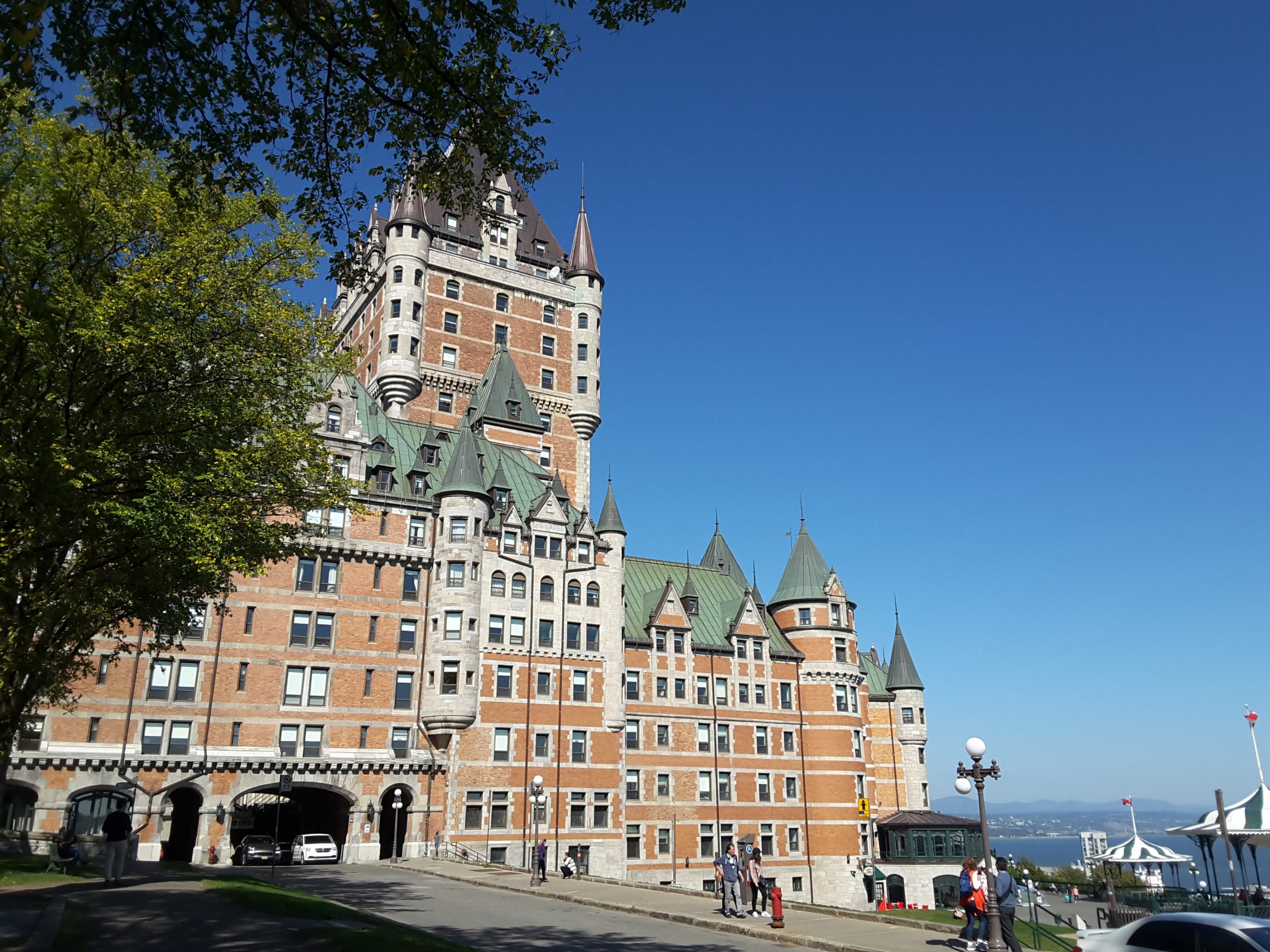 Wer nicht zu Fuß gehen will, kann das Furniculaire nutzen, ich steige jedoch über die Cote de Montagne hinauf zum Place d’Armes, mit Blick auf das Chateau Frontenac, das heute ein Luxushotel ist. Ich durchquere den Innenhof des Schlosses und verweile ein wenig auf einer Bank im Park nebenan, bei Sonnenschein, angenehmen 21 Grad und kühlem Wind.